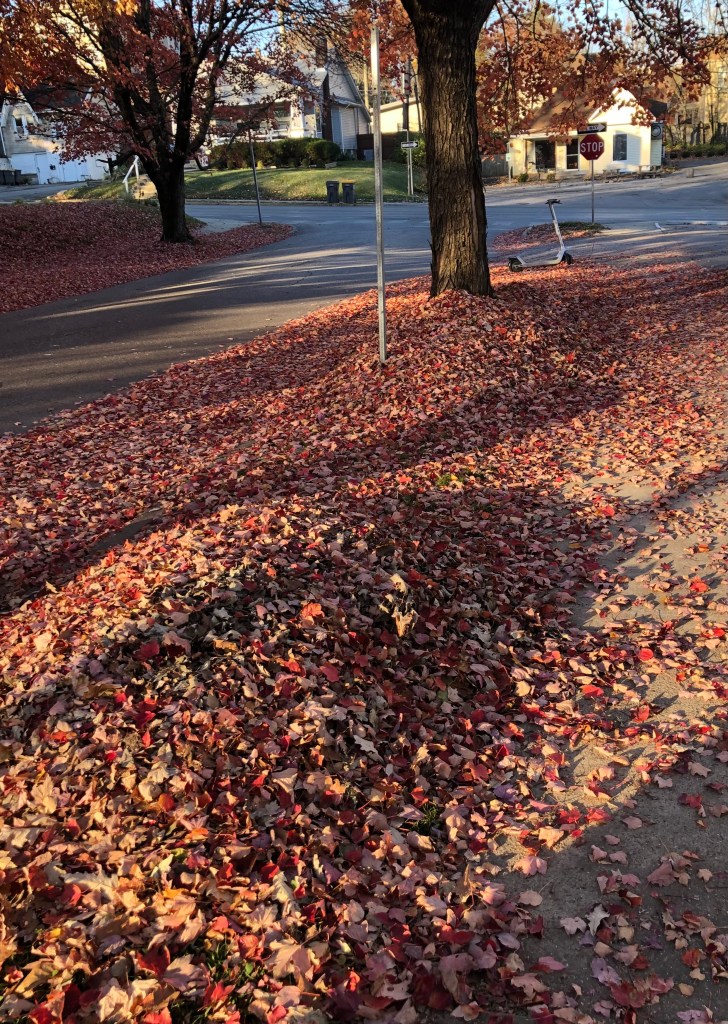 Walking home from the barber shop, I spied the leaf-dome someone had piled together the day before.  At age six or seven or ten, there would have been no doubt about it.  Leaves might be designed for photosynthesis and then mulch but in the second week of November, banked high they were meant to be jumped upon, rolled in, and enjoyed!  The colors, the smells and cushy landings are autumn’s gift and a child’s hankering.  Don’t stop to worry about hidden objects — tree branches, or broken glass, or rocks or… well, a surprise gift from a passing pooch. Go for it?